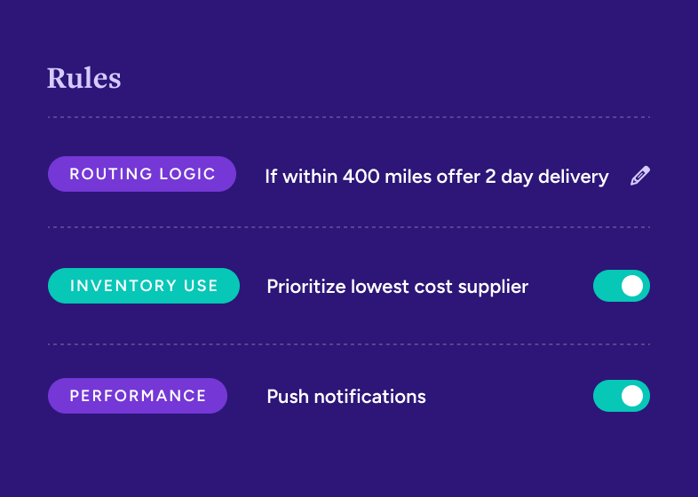 Define rules for routing, inventory use, and performance tracking and let us do the heavy lifting behind the scenes.
